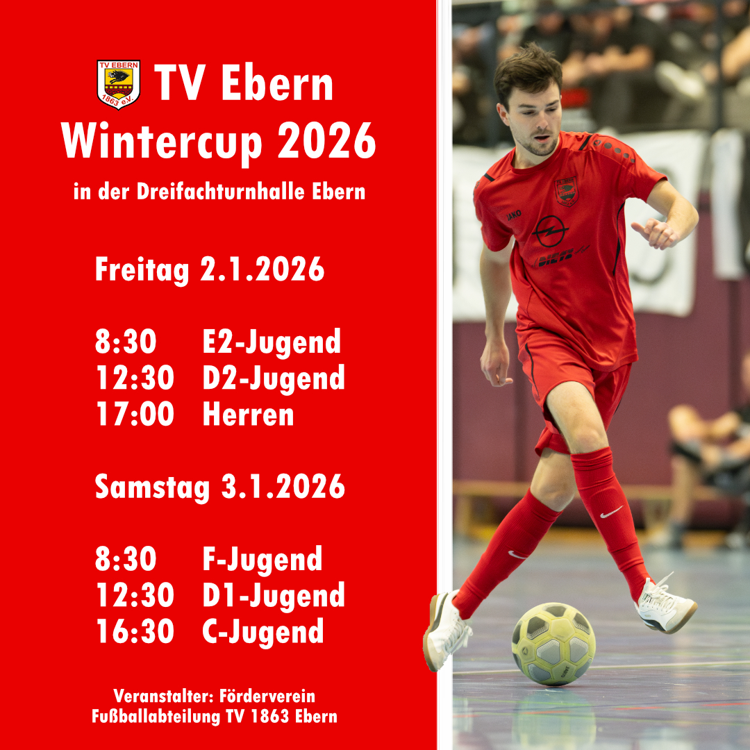 Gleich zu Beginn des neuen Jahres steht mit dem alljährlichen Wintercup bereits ein Highlight vor der Tür. Am 2. und 3.1 rollt der Ball in der Eberner Dreifachturnhalle. Kommt vorbei und freut euch auf spannende Turniere, viele Tore und gute Verpflegung!
